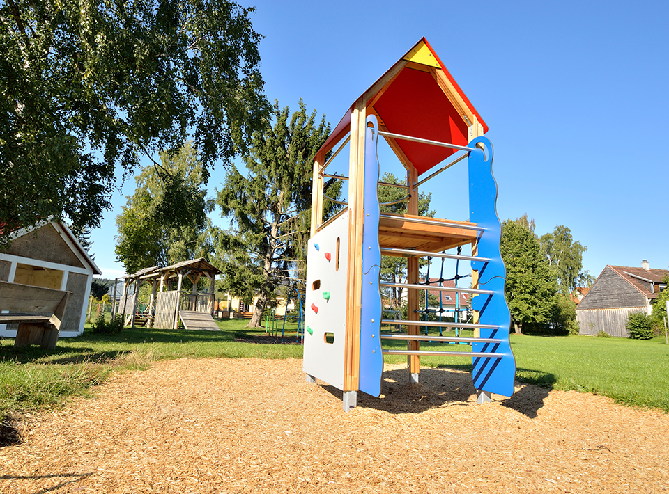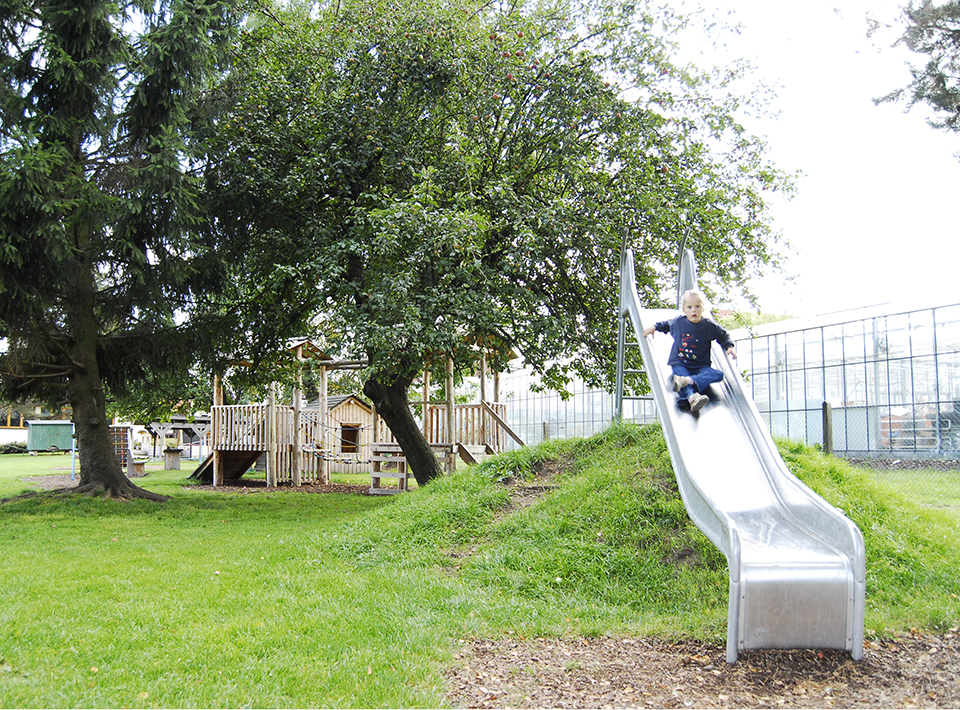 Einzigartig ist der große Garten mit vielen Bewegungsmöglichkeiten und Spielgeräten sowie einem überdachten Bereich, der auch bei Regen Schutz bietet.
